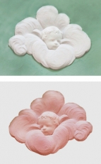 Korset danner kontrast gennem en blank thaisilke, som har lidt struktur i overfalden. Englene fra loftudsmykningen i kirken, tænkes fotooverført på en rosafarvet, glat silkesatén og applikeres på med en let vatteret, relief effekt. Samme rosa farve bruges til foret. En hudfarve, som understøtter den blottede tilstand i anger og tilgivelse.